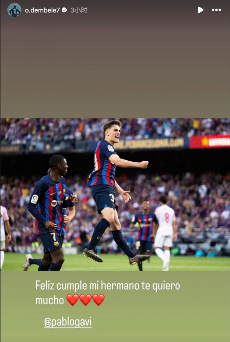 登贝莱晒出与加维昔日并肩作战的照片,并配文写道:生日快乐,我的兄弟,我非常爱你❤️❤️❤️@加维